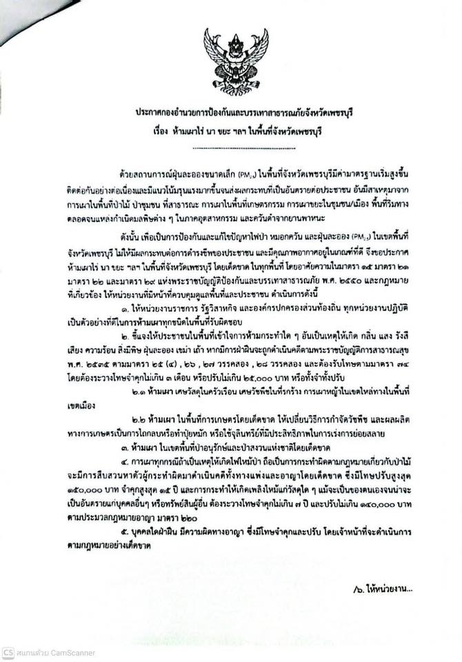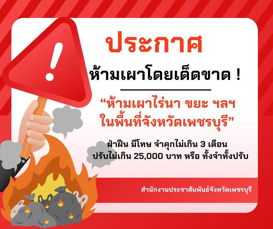 ประกาศจังหวัดเพชรบุรี “ ห้ามเผา ไร่ นา ขยะ ฯลฯ ในพื้นที่จังหวัดเพชรบุรี” มีโทษ จำคุกไม่เกิน 3 เดือน ปรับไม่เกิน 25,000 บาทหรือทั้งจำทั้งปรับ
