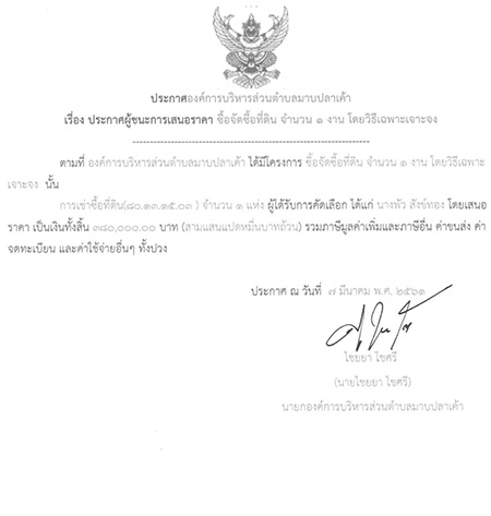 ประกาศสรุปผลการจัดซื้อที่ดิน จำนวน 6 ไร่ 51 ตารางวา